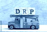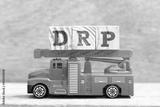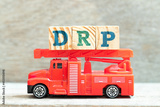 Fire ladder truck hold letter block in word DRP on wood background