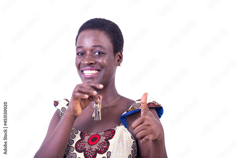 beautiful young woman holding keys and showing thumb.