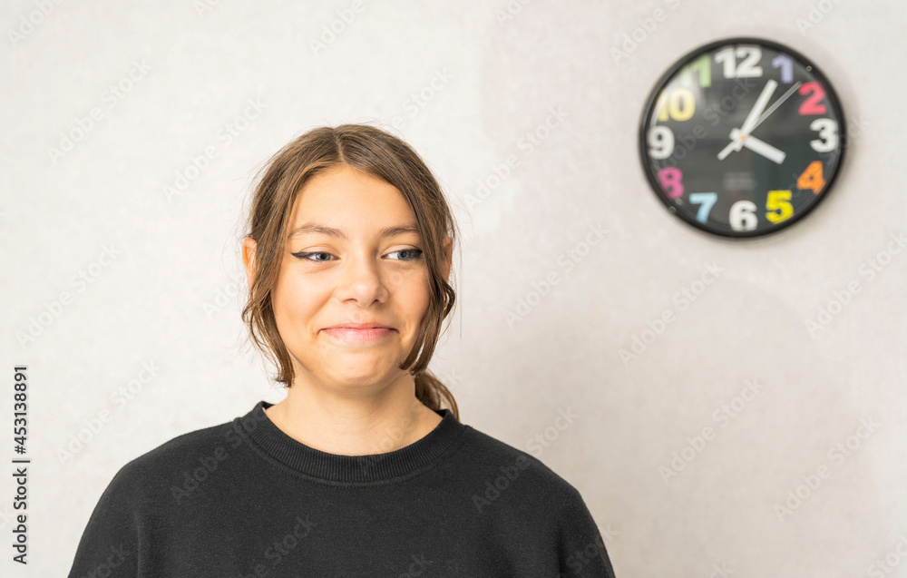 Portrait of a pretty European teenage girl on a light background, smiling, looking at camera. a happy schoolgirl