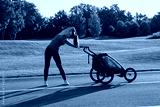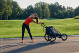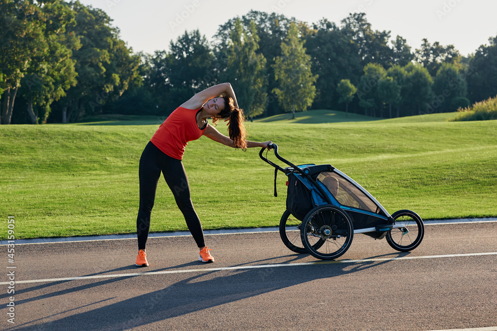 Young woman doing gymnastics while walking with her child in baby stroller at public park. Part of a set of exercises for young women with children during motherhood