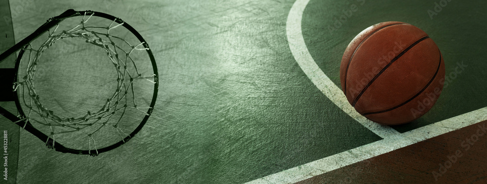orange obsolete basketball on green floor with white line and hoop with net sport banner background