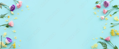 Top view image of pink, yellow and purple flowers composition over pastel blue background .Flat lay