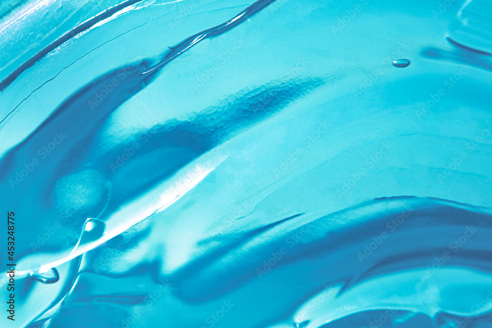Cool Blue liquid cosmetic water gel smudged texture. Abstract clear cosmetic cream, hyaluronic acid, face serum, moisturizer background