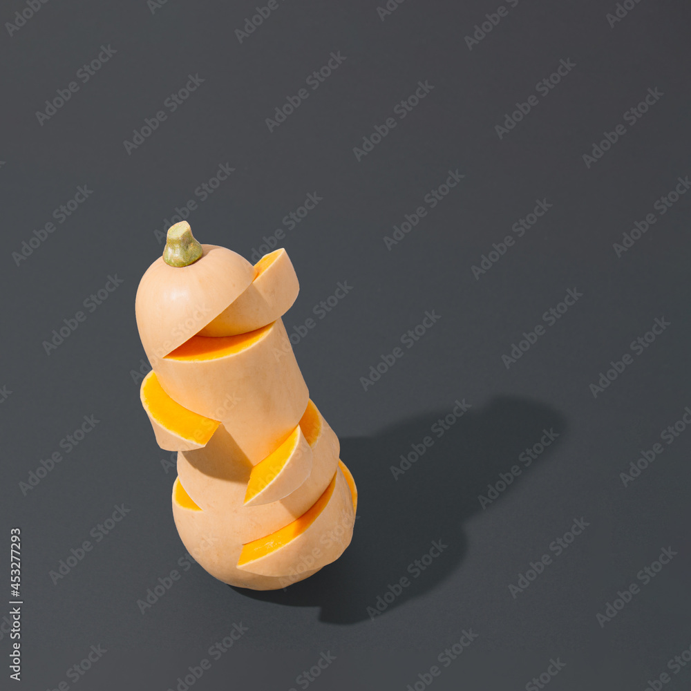 Butternut squash with cutouts on a dark gray background. Spooky Halloween pumpkin concept. Minimal horror autumn food arrangement.