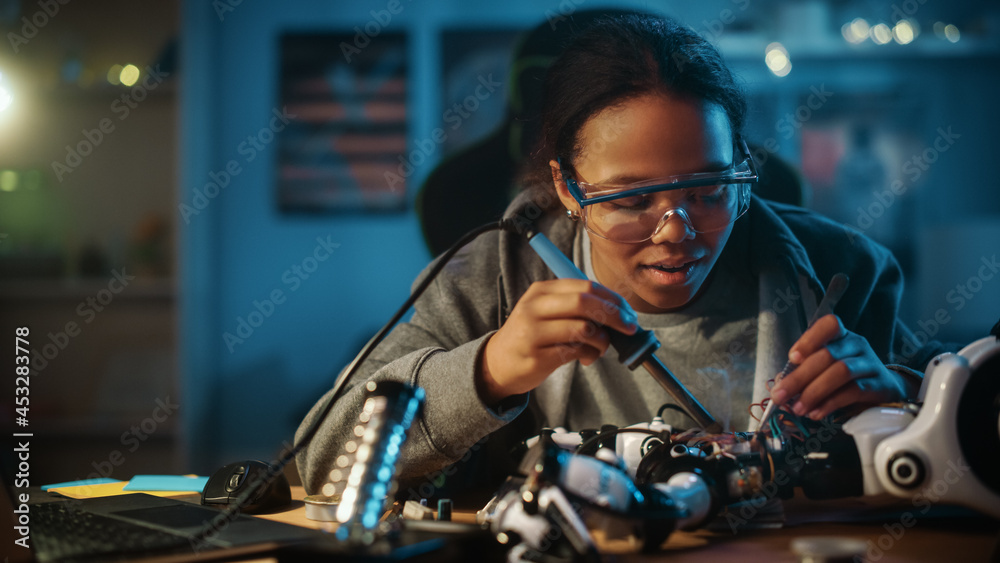 Young Teenage Multiethnic Schoolgirl is Studying Electronics and Soldering Wires and Circuit Boards in Her Science Hobby Robotics Project. Girl is Working on a Robot in Her Room. Education Concept.