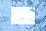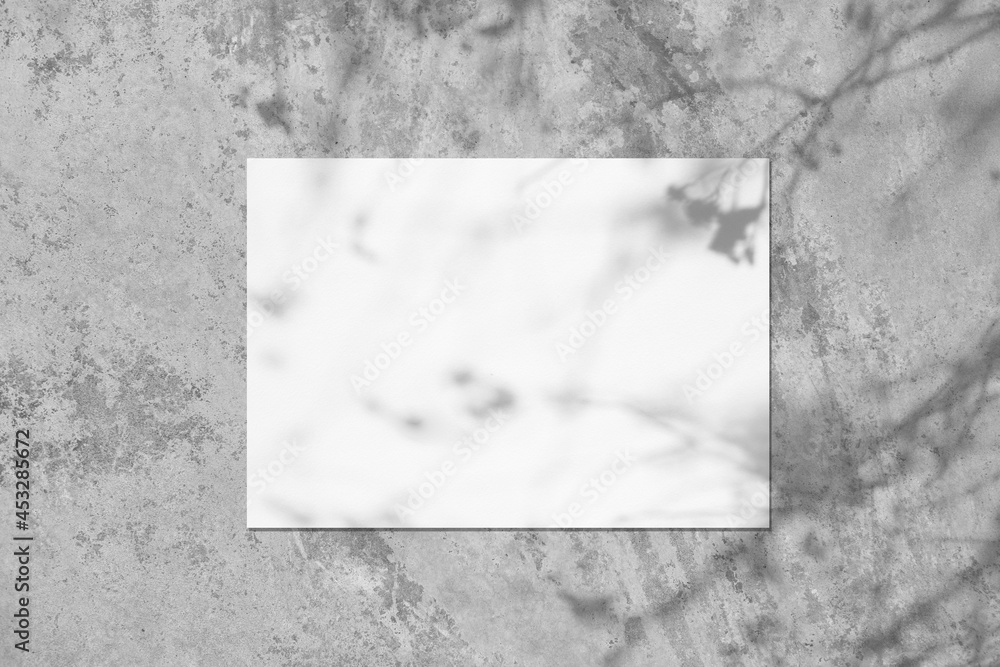 Empty white horizontal rectangle poster or card mockup with soft tree leaves and branches shadows on neutral light grey concrete wall background. Flat lay, top view