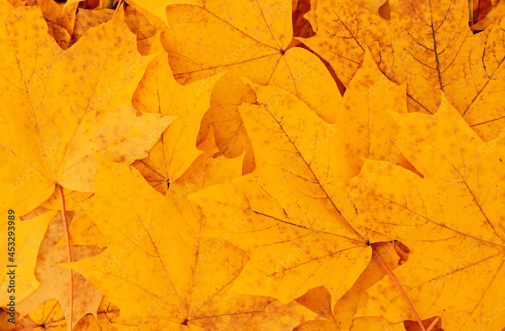 Golden maple leaves nature background. Flat lay style. Copy space.