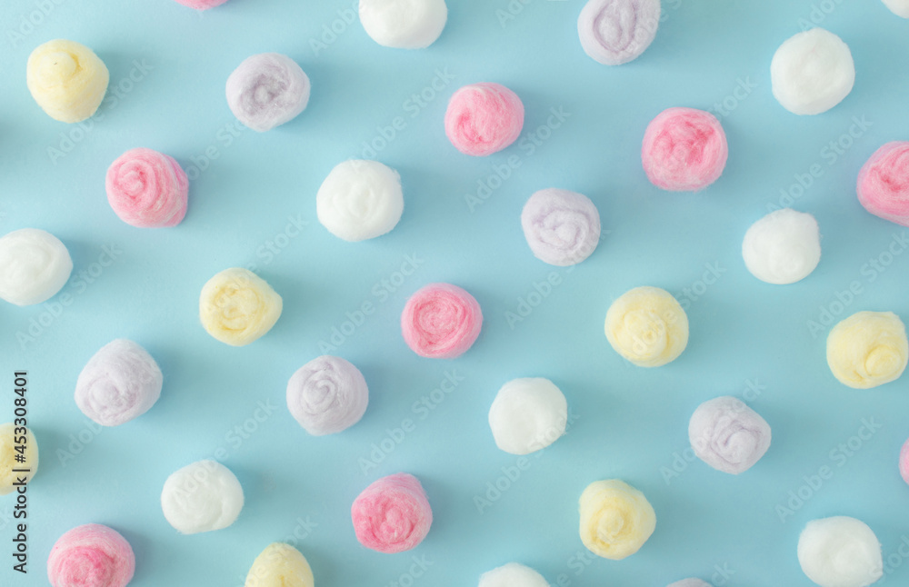 White, yellow, lilac and pink cotton balls against pastel blue background. Minimal natural concept. Flat lay.