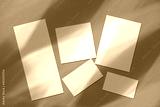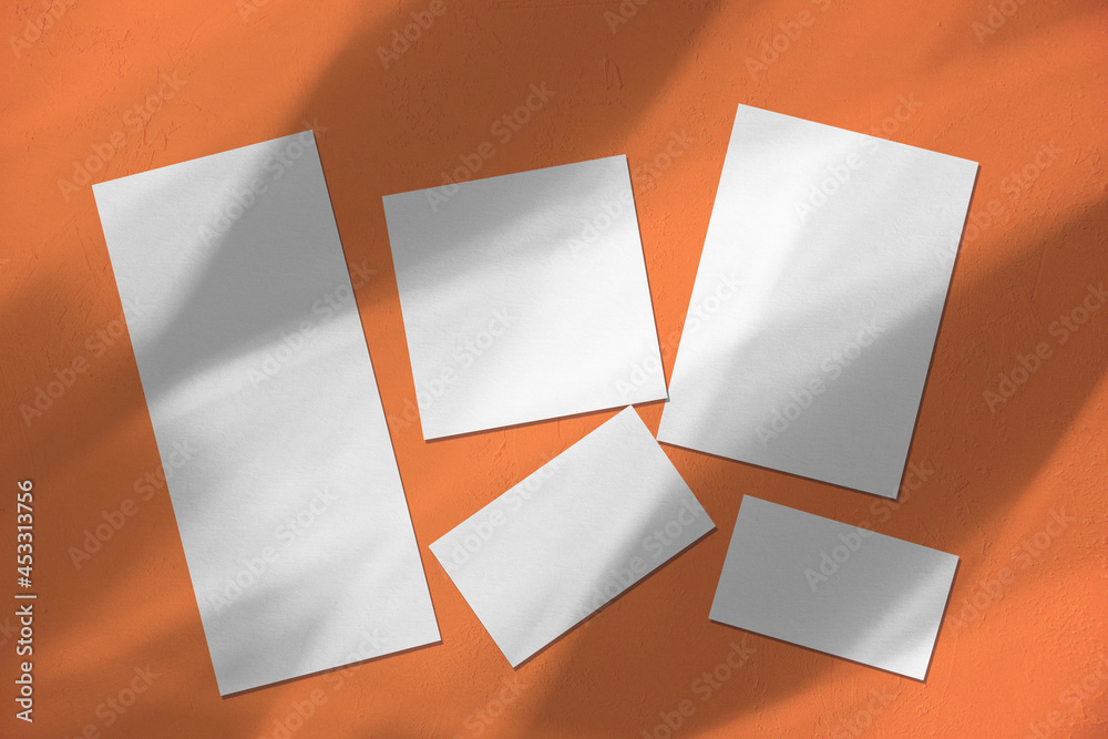 Empty white wedding stationery mockups with overlay of light refraction caustic effect on orange background. Blank invitation, greeting card, menu, rsvp, table card, thank you card. Flat lay, top view