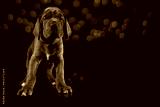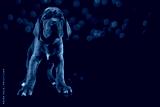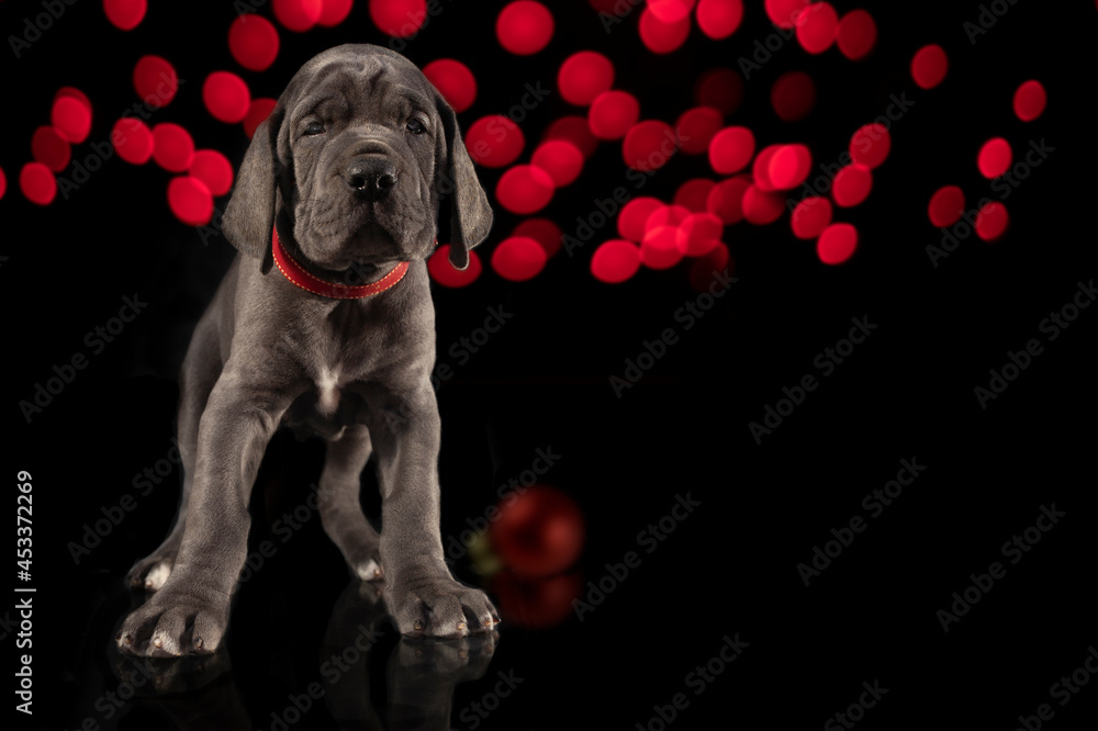 Gray purebred Great Dane puppy with red lights on a Christmas tree and single red ornament