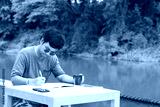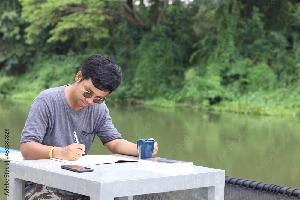 A handsome Asian man with black hair and glasses who dreams of becoming a book writer. Working off-site on holiday travel writing live with nature by the water with relaxation and peace of mind.