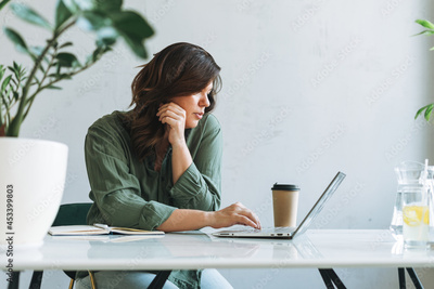 Young thinking brunette woman plus size working at laptop on table with house plant in bright modern office