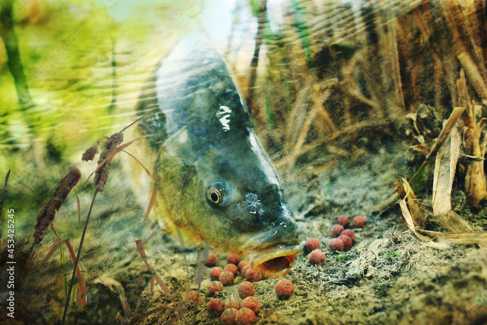 wild carp under water in thickets of grass