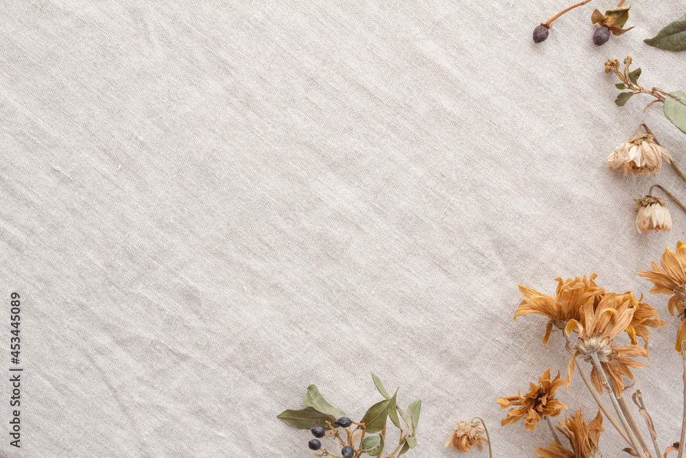 麻の布の背景のドライフラワーのオレンジのドライフラワーの右下の飾りフレーム