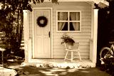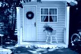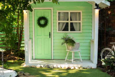 Interior Cozy veranda house with chair and basket flowers. Decor outdoor of summer yard. Facade House decorated for autumn holidays. Exterior Wooden porch home with garden furniture.