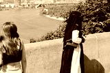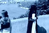 A woman looking suspiciously on a muslim girl wearing covered black and white clothes. European city. Conflict. New. Refugee. Belief