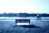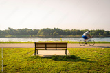 Resting bench on the green riverbank park. Topographical image of the sky, forest, canal, bikeways, and meadow. The bike lane landscape on Cape Cod Canal.