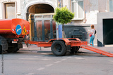 Municipal car with cistern and trailer parked on the cit's roadway. Tank. Street. Outdoor. Transportation. City. Urban