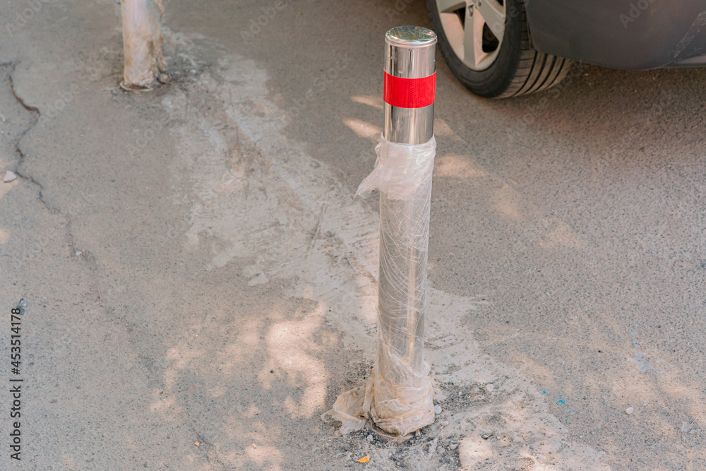 Brand new unpacked stainless steel bollard barrier with red stripe. Stainless steel pole for people for security. New parking barrier post. Prevent. Prevention movement