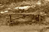 Green broken bench outdoor. Street. Park. Vandals. Wooden. Ground. Damage. Damaged