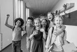 cheerful multiethnic kids embracing, waving hands and showing rejoice gesture at school