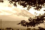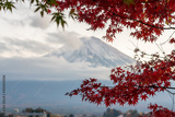Peak of Mount Fuji in early morning fog during autumn season