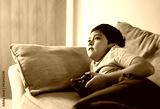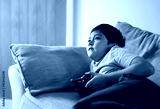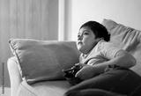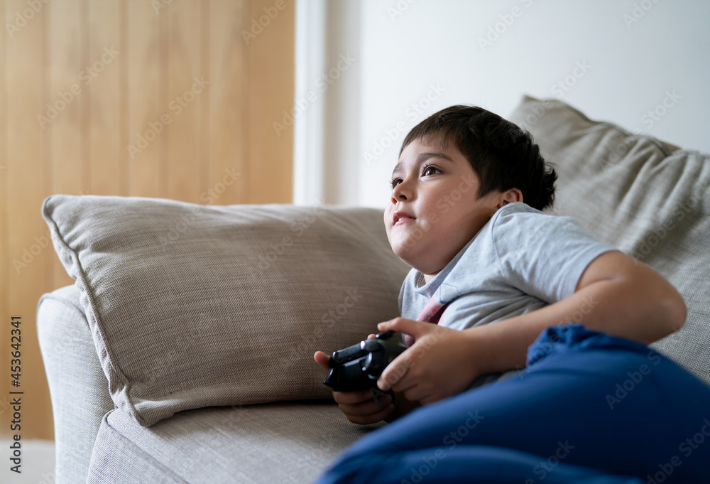 Young boy playing video games online, Candid shot Happy mixed race child lying on sofa holding game console. Portrait kid face looking up while relaxing at home on weekend