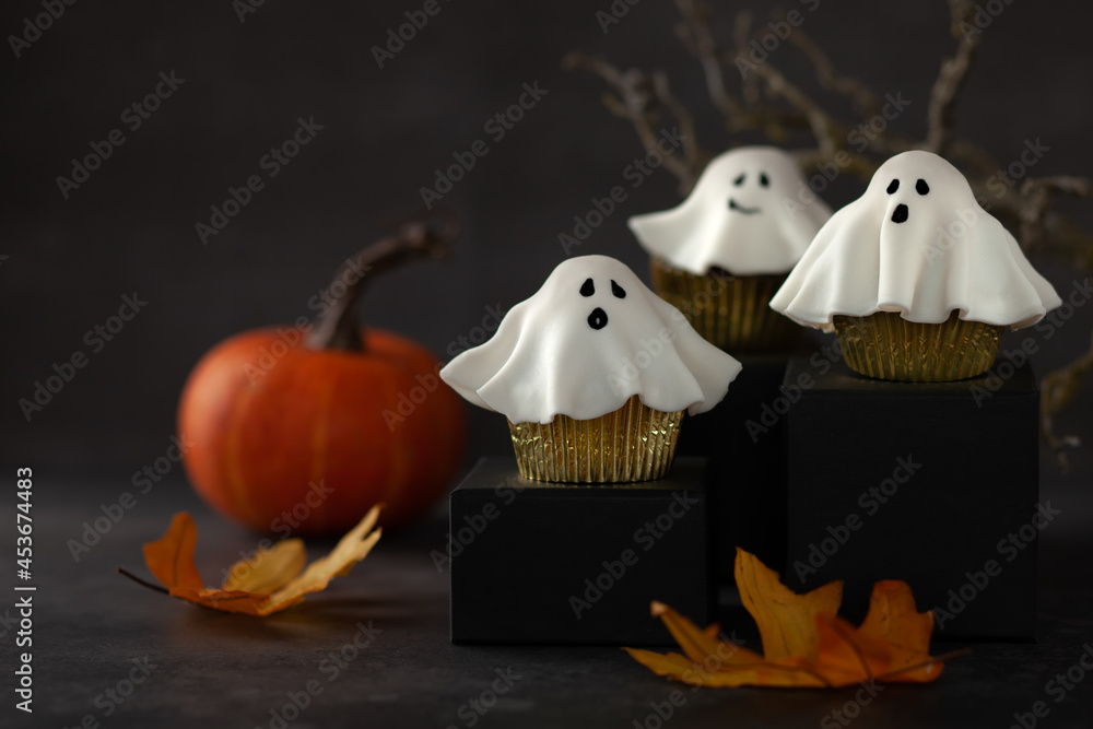 Halloween fondant ghost cupcakes on black podiums. Halloween party food idea.