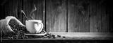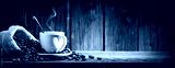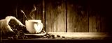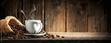 Small White Espresso Cup With Heart Shaped Handle On Wooden Table With Burlap Sack And Coffee Beans