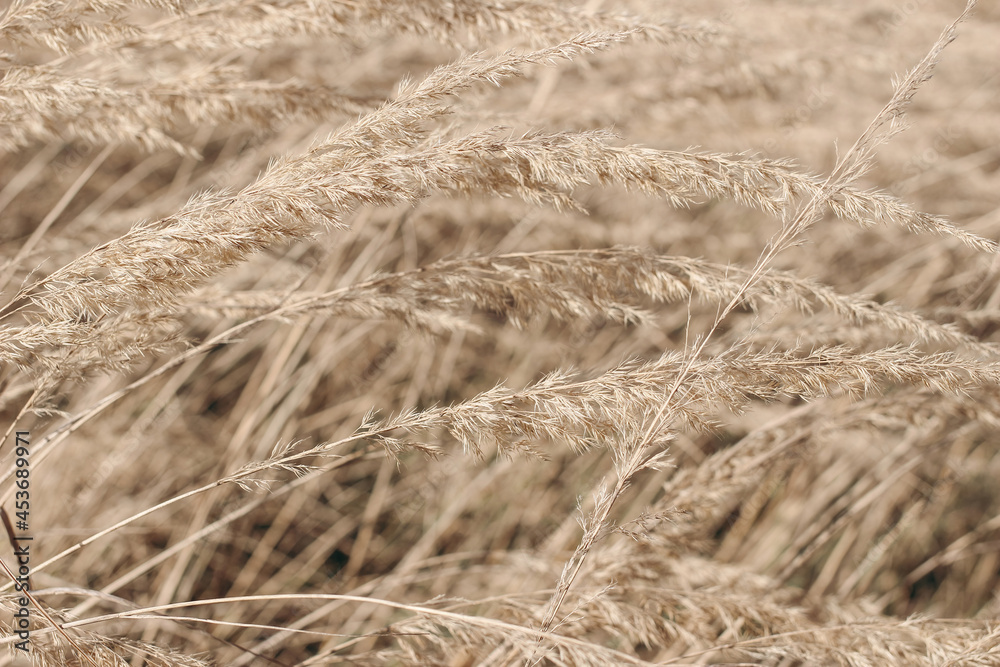 Decorative floral texture. Field of golden dry festuca grass. Autumn landscape in sunlight. Closeup of fading wild meadow plants. Selective focus, blurred background. Seasonal nature concept.