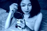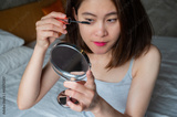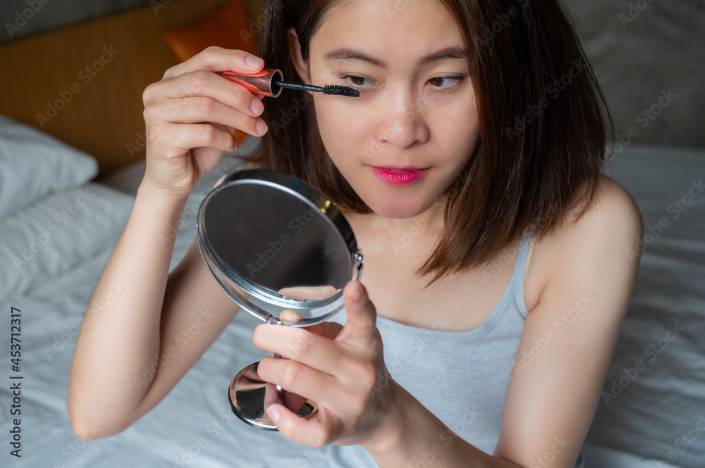 Portrait of young Asian woman applying black mascara on her eyelashes with a wand applicator. Mascara is a cosmetic commonly used to enhance the eyelashes.