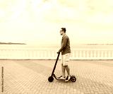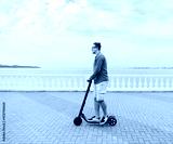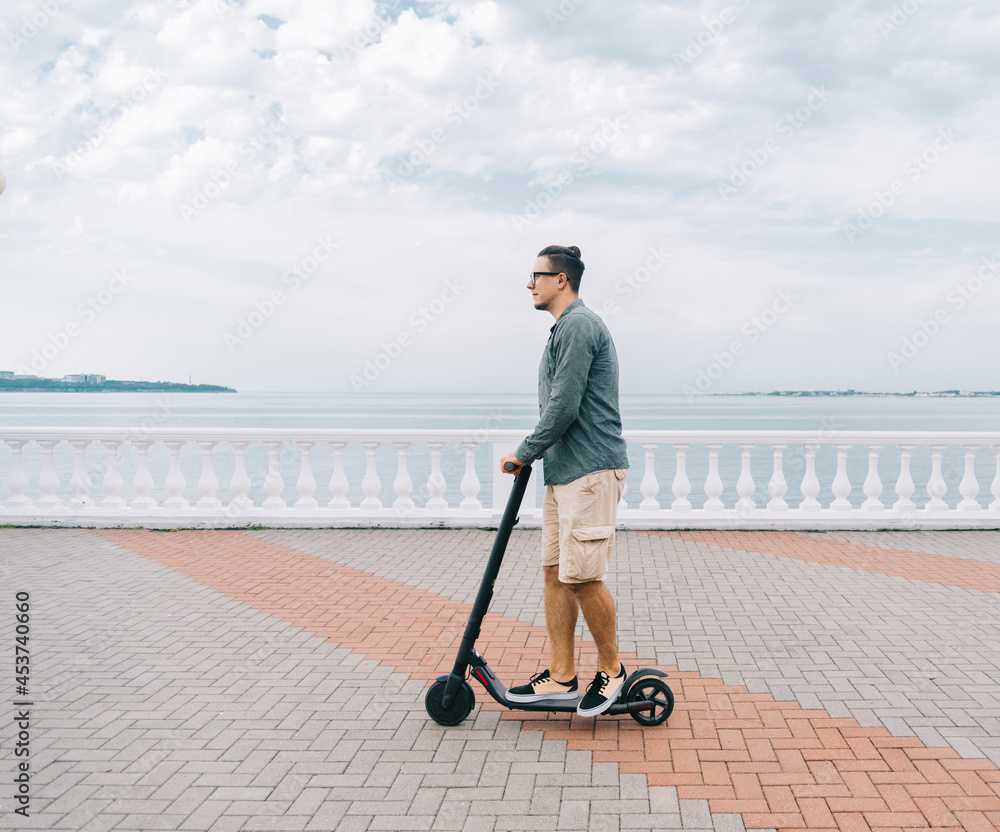 Young millennial man while riding on the electric scooter. Eco-friendly urban transport.
