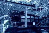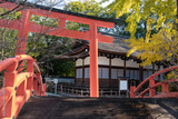 京都下鴨神社の朱色の鳥居 秋の黄葉と青空背景に