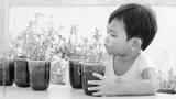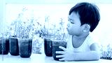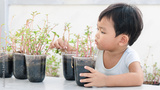 asia adorable cute little kid boy planting flowers in home's garden. Child having fun with gardening.