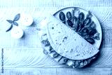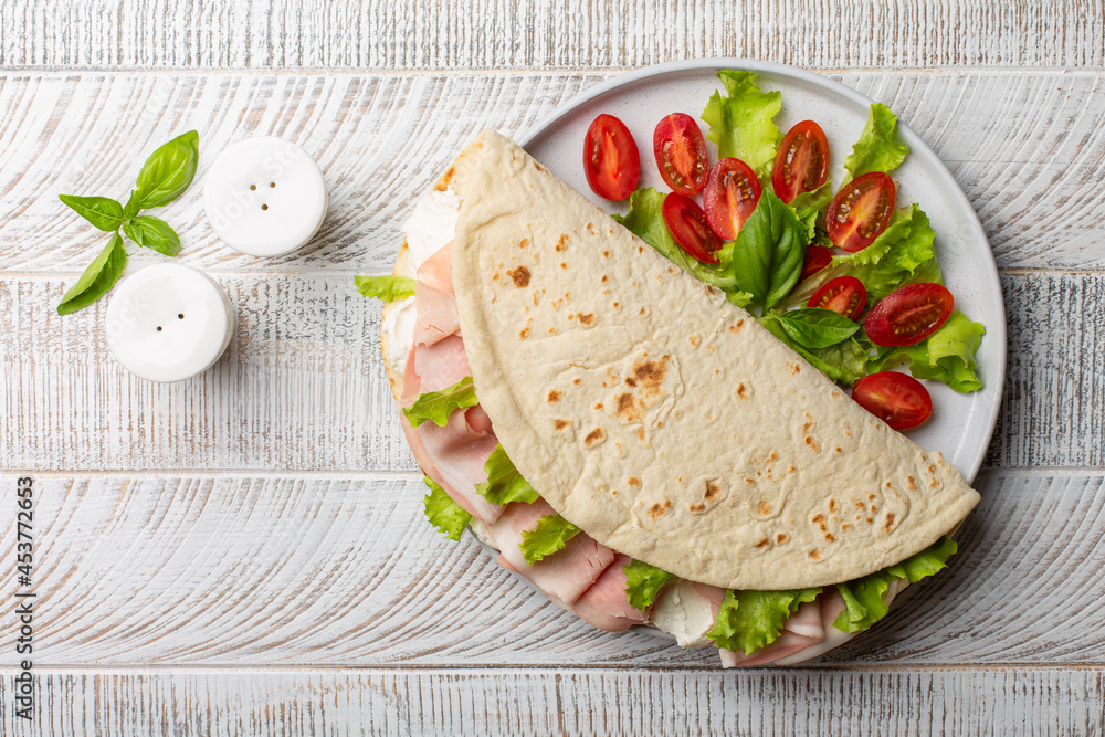 Italian summer lunch. Piadina romagnola, traditional italian flatbread with ham, soft cheese and lettuce, fresh salad with tomatoes. On a white wooden table, top view.