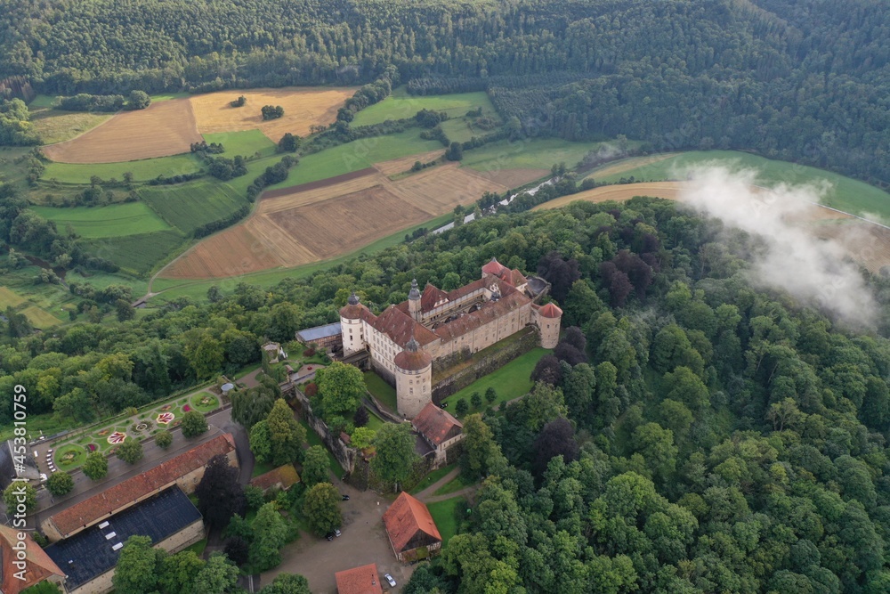 Aerial drone shot of Langenburg Castle in Langenburg, Germany on a misty afternoon