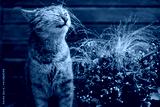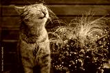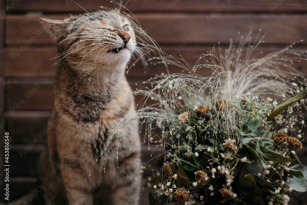 Domestic ginger cat sniffing a bouquet of wilted flowers on a wooden background.