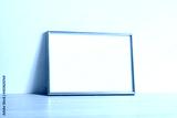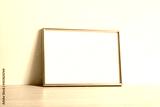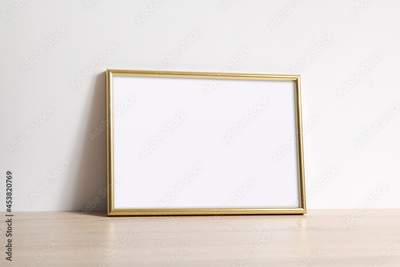Pusta złota ramka na zdjęcia na komodzie oparta o ścianę