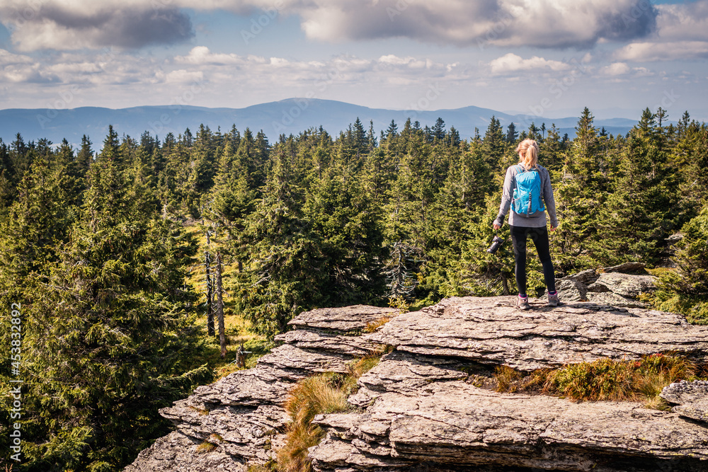 Woman photographer with backpack and camera standing at rocky mountain peak and looking for composition. Hiking and adventure concept. Outdoors active lifestyle