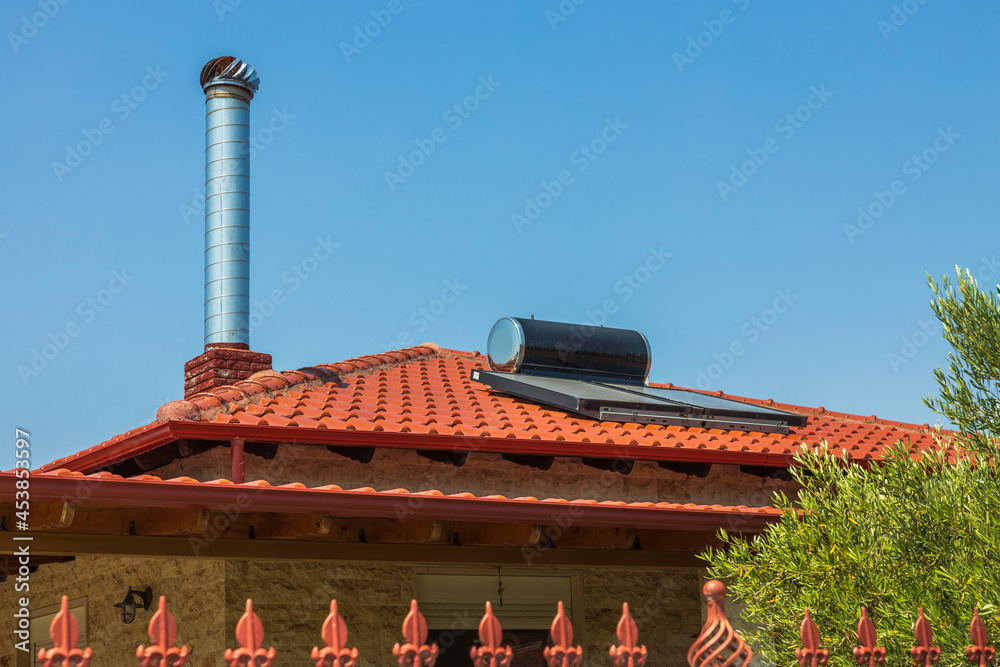 Close up view of solar cell battery on red roof on blue sky background. Greece.