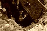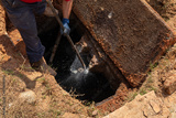 Man breaking apart a wastewater outlet in an old septic tank to bring it up to code, horizontal aspect