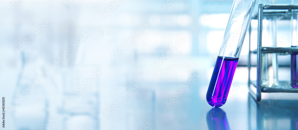 purple test tube in chemistry science research lab white blue banner background.