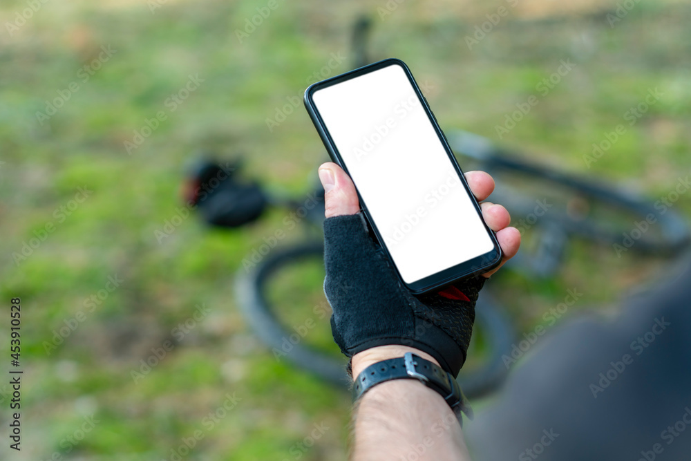 Cyclist holds mockup smartphone close-up with a white screen in his hands on the background of a bicycle in nature.