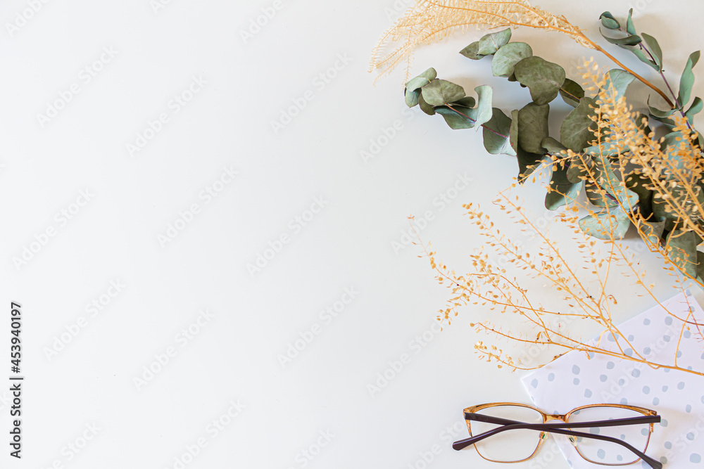 Beige frame with blank copy space made of beautiful dry plant branches on white background. Flat lay, top view.