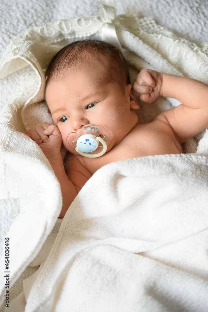 A newborn charming baby with a pacifier in his mouth. Close-up.