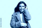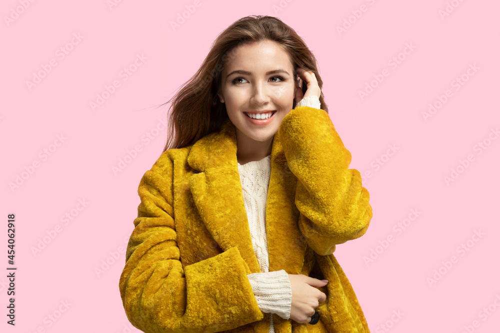 Beautiful smiling young woman with long healthy hair on pink studio background with copy space. Fashionable happy girl wearing stylish yellow coat, casual attire. Natural beauty, style and fashion.