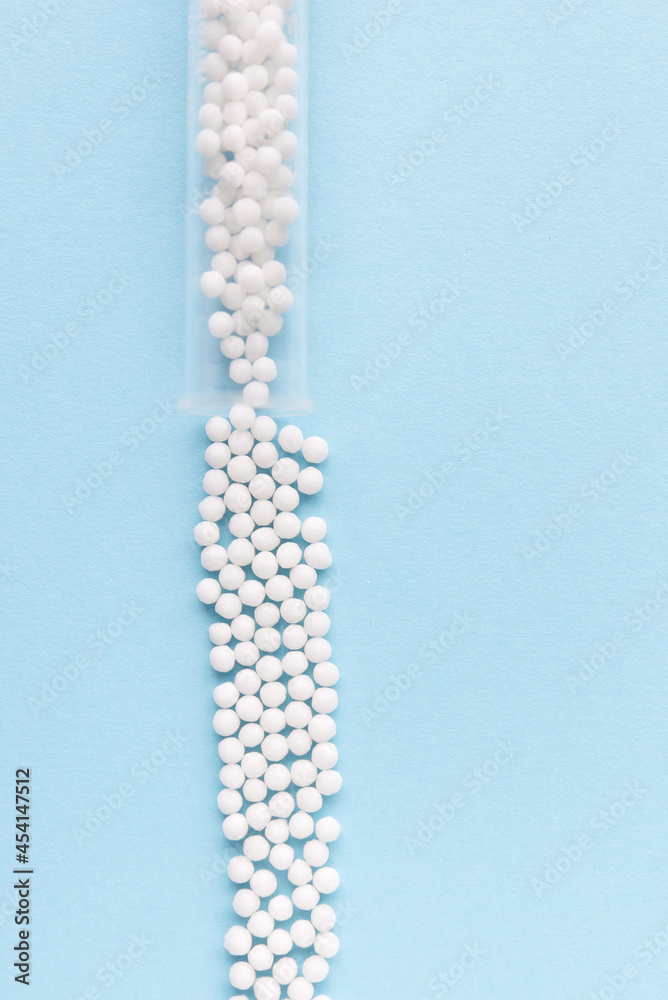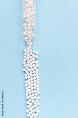 Homeopathy medicine alternative herbs. Homeopathic globules and glass bottle on a blue background. Health care and medicine concept.