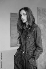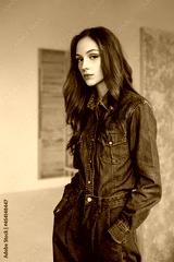 Fashionable woman wearing trendy blue denim shirt, jeans. Model posing in studio with natural day light