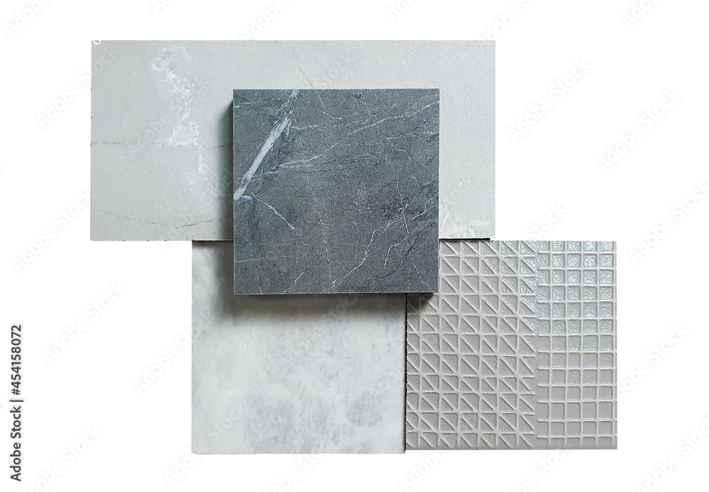 interior stone and pattern tile samples consists grey emperado marble, black marble, graphic pattern textures isolated on white background with clipping path. floor or wall tile collection.