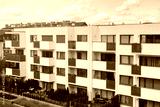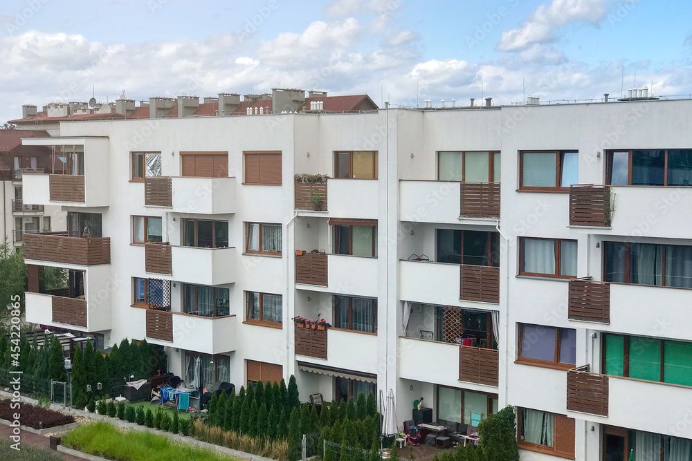 A modern low-rise home with small balconies and large windows set against a blue sky.